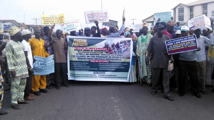 Scores of retirees from Osun State Civil Service on Wednesday trooped out and staged a protest against non payment of their gratuities and payment of half pensions by